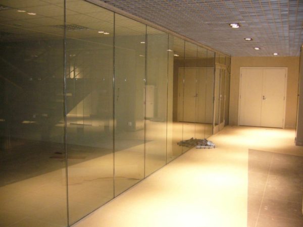 Матовые стеклянные противопожарные перегородки могут изготавливаться как в полностью остекленном варианте, так и в частично остекленном исполнении. Основное предназначение таких конструкций — это разделение общего помещения на несколько отдельных рабочих зон. При этом преследуется несколько целей:
