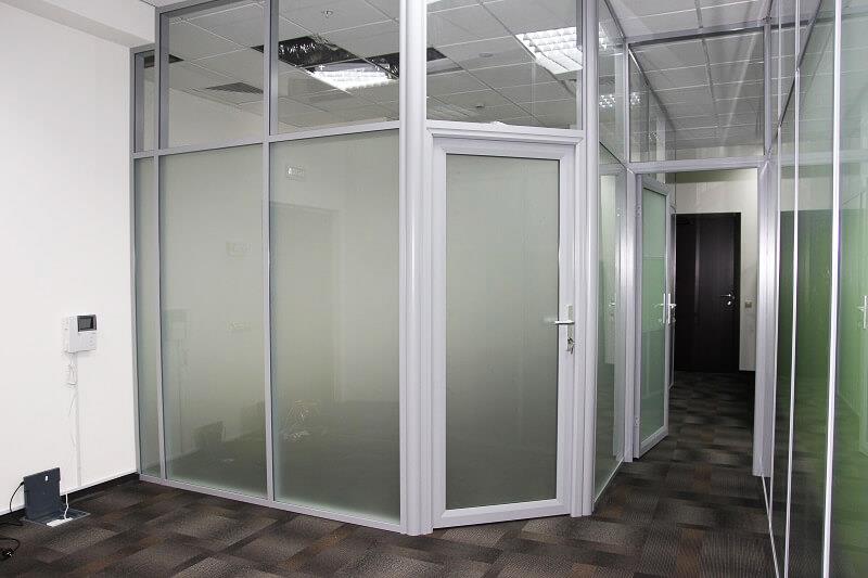 Матовые стеклянные противопожарные перегородки могут изготавливаться как в полностью остекленном варианте, так и в частично остекленном исполнении. Основное предназначение таких конструкций — это разделение общего помещения на несколько отдельных рабочих зон. При этом преследуется несколько целей: